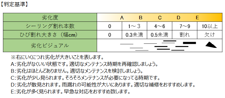 立地的環境や外壁の素材の確認、更にはメンテナンス状況などを総合的に判断して劣化度をランク付けします。