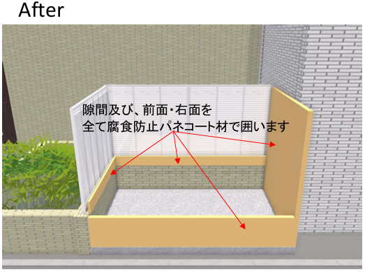 私たちの提案は、防腐処理を施した高品質の板材を使用して、柵の隙間を無くすというものでした。これにより、カラスや野良猫の侵入を防ぎ、より清潔で快適なゴミ集積スペースを実現することができると考えました。