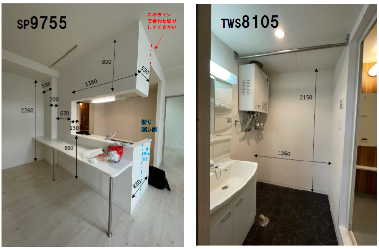 撮影した写真に直接寸法や特記事項を書き込みます。たとえば、壁の高さや幅、窓やドアの位置やサイズ、コンセントの位置などを記入します。これにより、職人さんが正確な作業範囲や寸法を把握しやすくなります。