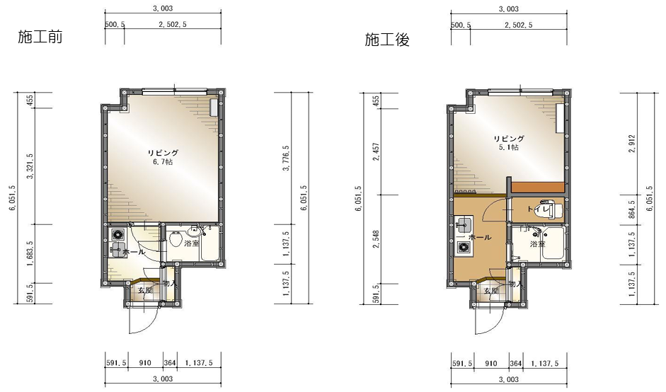 古くなった3点ユニットバスの解体とトイレの独立化を行い、現代的で魅力的な1ルーム物件へと生まれ変わらせることを考えました。