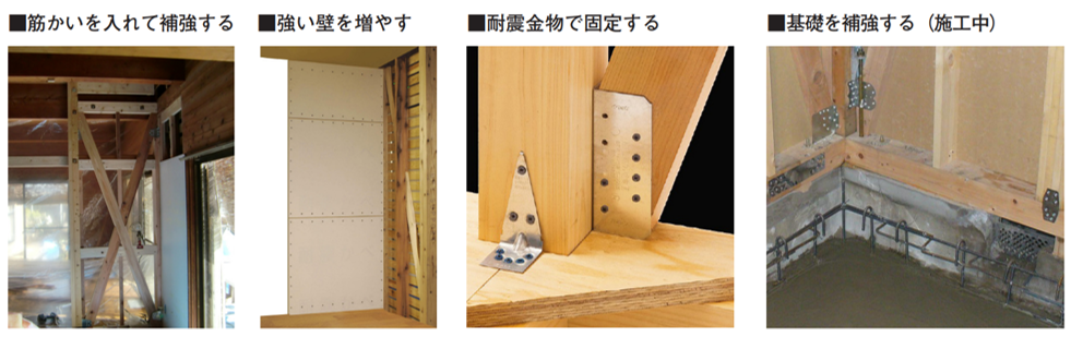 一般的な木造住宅は、柱と梁、壁が一体となって地震に耐える構造のため、柱の間に筋かいを入れたり柱や耐力壁を増やすなどして強化します。柱や梁、基礎とその土台などの結合部は、耐震金物などでしっかりとつなぎ合わせることができます。