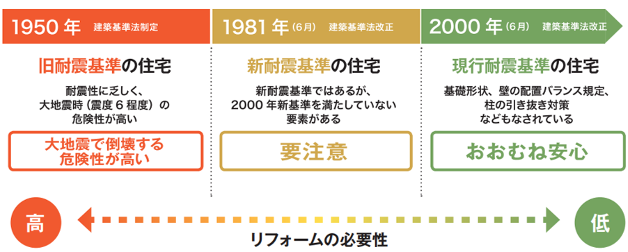 1981年5月以前の木造住宅は、旧耐震基準であり実際の地震の被害が大きいデータが報告されており、最もリフォームが必要な住宅です。2000年に建築基準法が改正され、耐震性能が大幅に高くなりました。