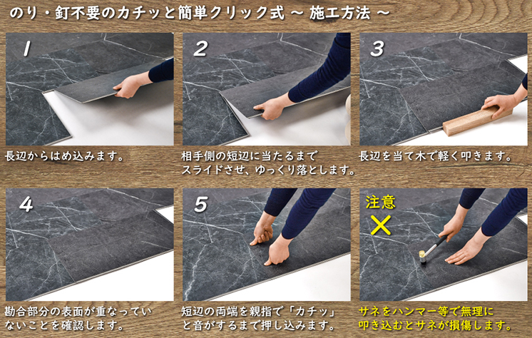 接着剤や釘を使用せず、はめ込むだけで簡単に施工でき、DIYでも手軽に施工可能です。