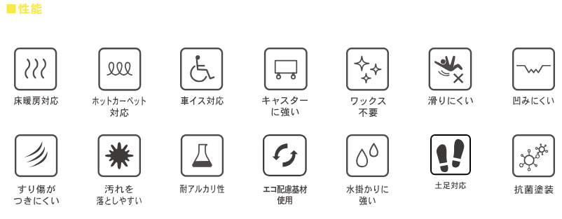 ビニルタイル素材を使用しており傷や汚れに強く、湿気にも強いため水回りや湿度の高い場所でも使用可能。
