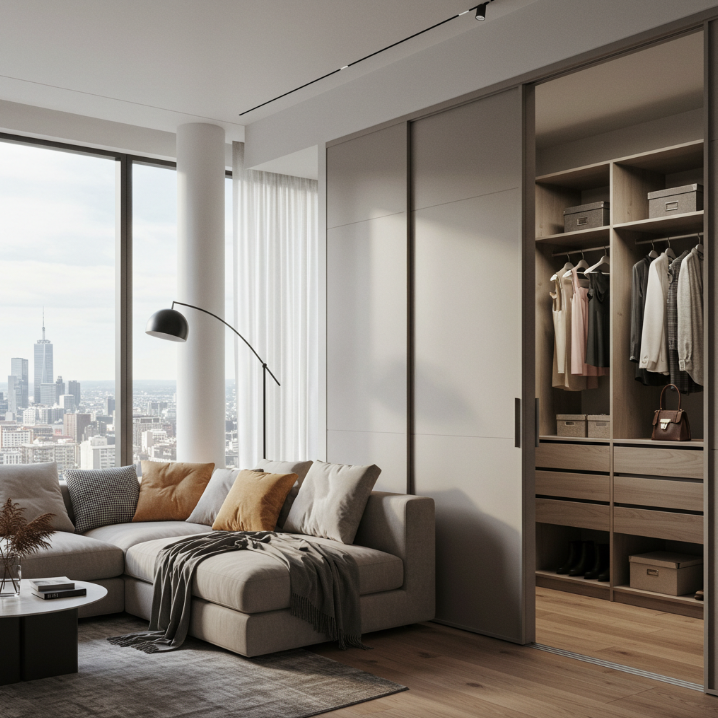 また、リビングやダイニングなど、普段の生活動線上に収納スペースを設ける際は、目立たない工夫を取り入れるのがポイント。壁面と一体化させた収納や、扉付きの収納などを活用すれば、生活感を隠し、シンプルでスッキリとした空間を保てます。
