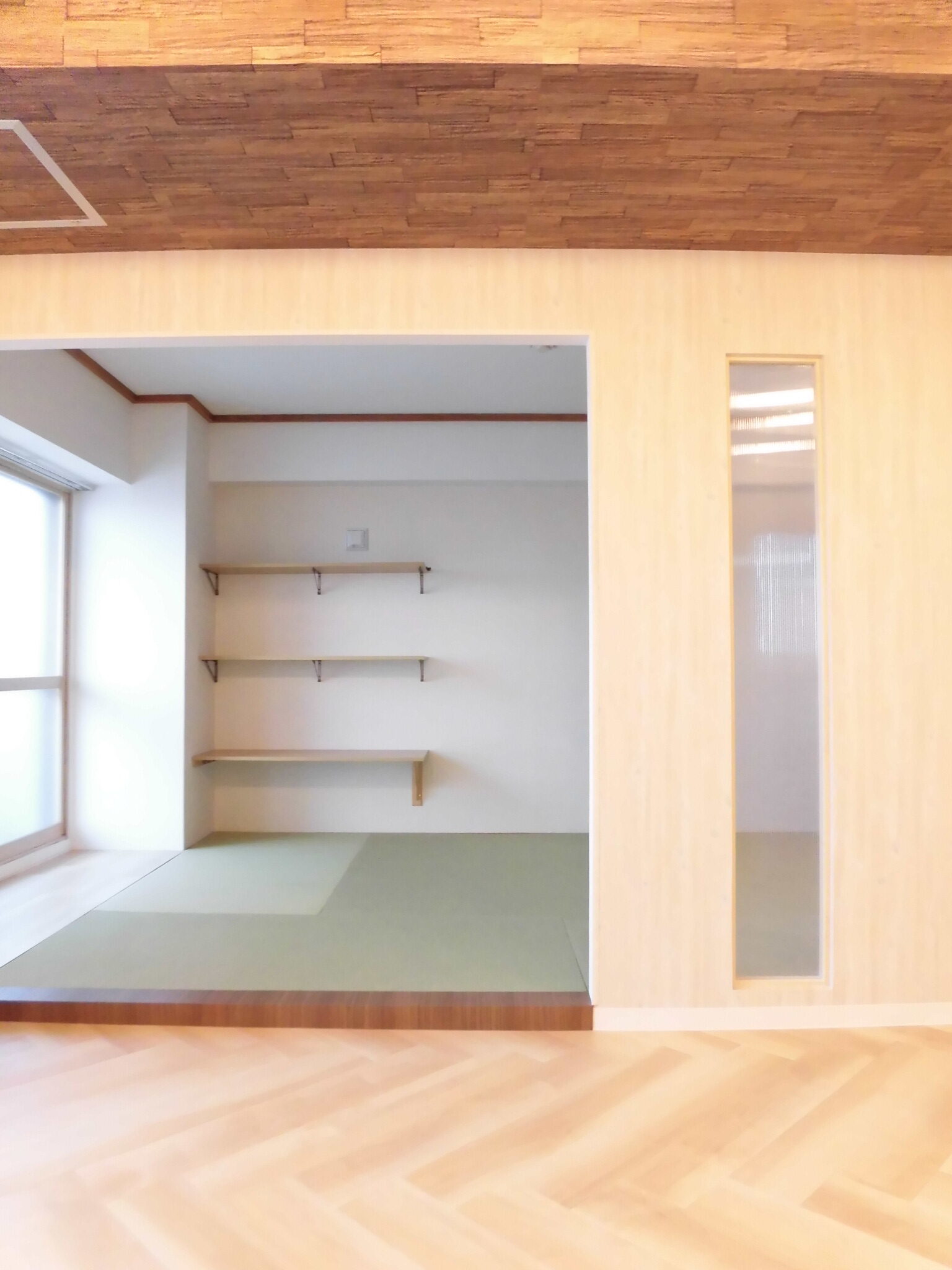 和の伝統とモダンなデザインが見事に融合され、新しい空間が生まれます。琉球畳と明るい壁紙の組み合わせは、日常生活に新たな活力とユニークな魅力を与えてくれることでしょう。是非、自分だけの個性的な空間を演出するために、この斬新なアイデアに挑戦してみてください。