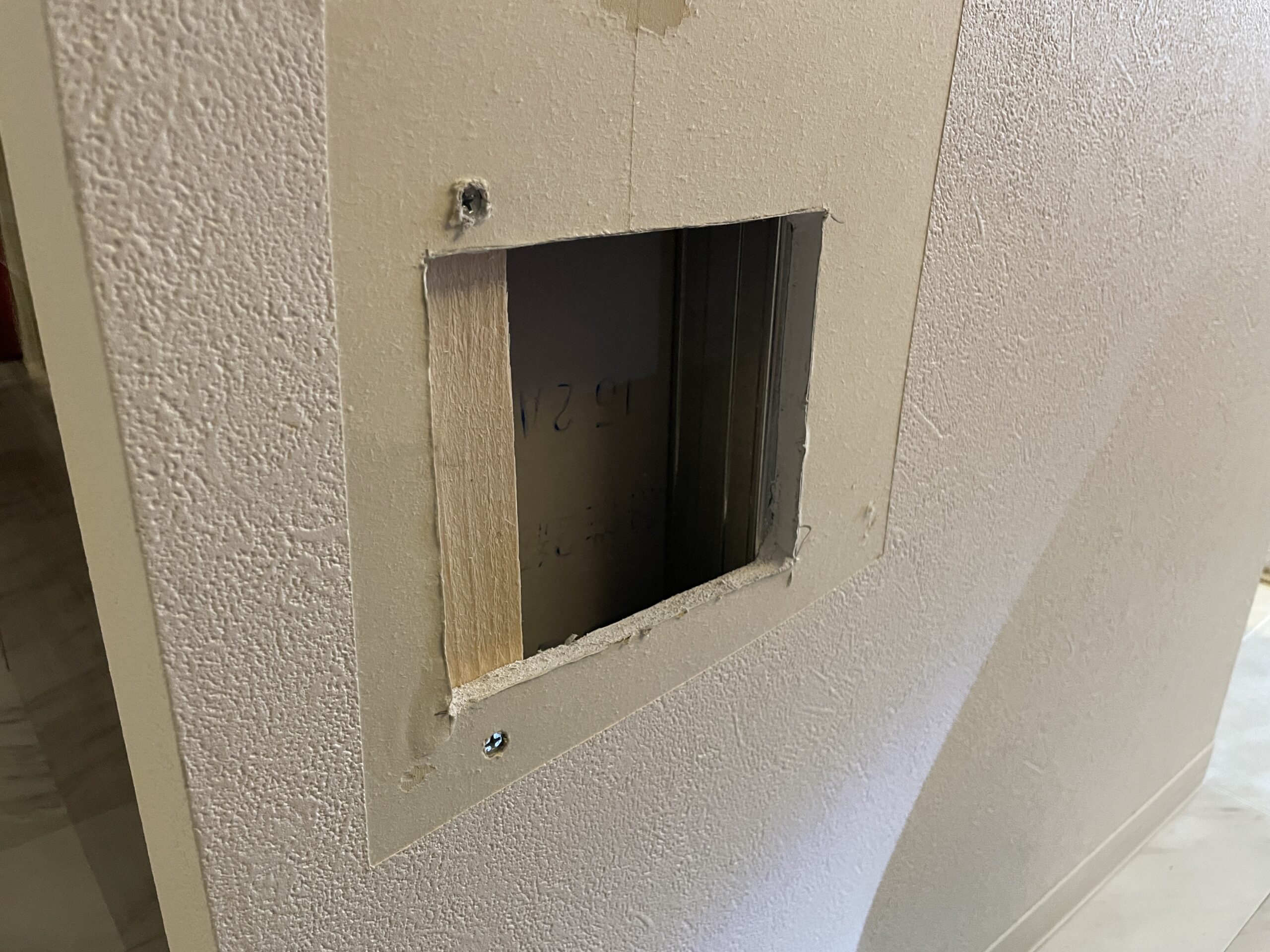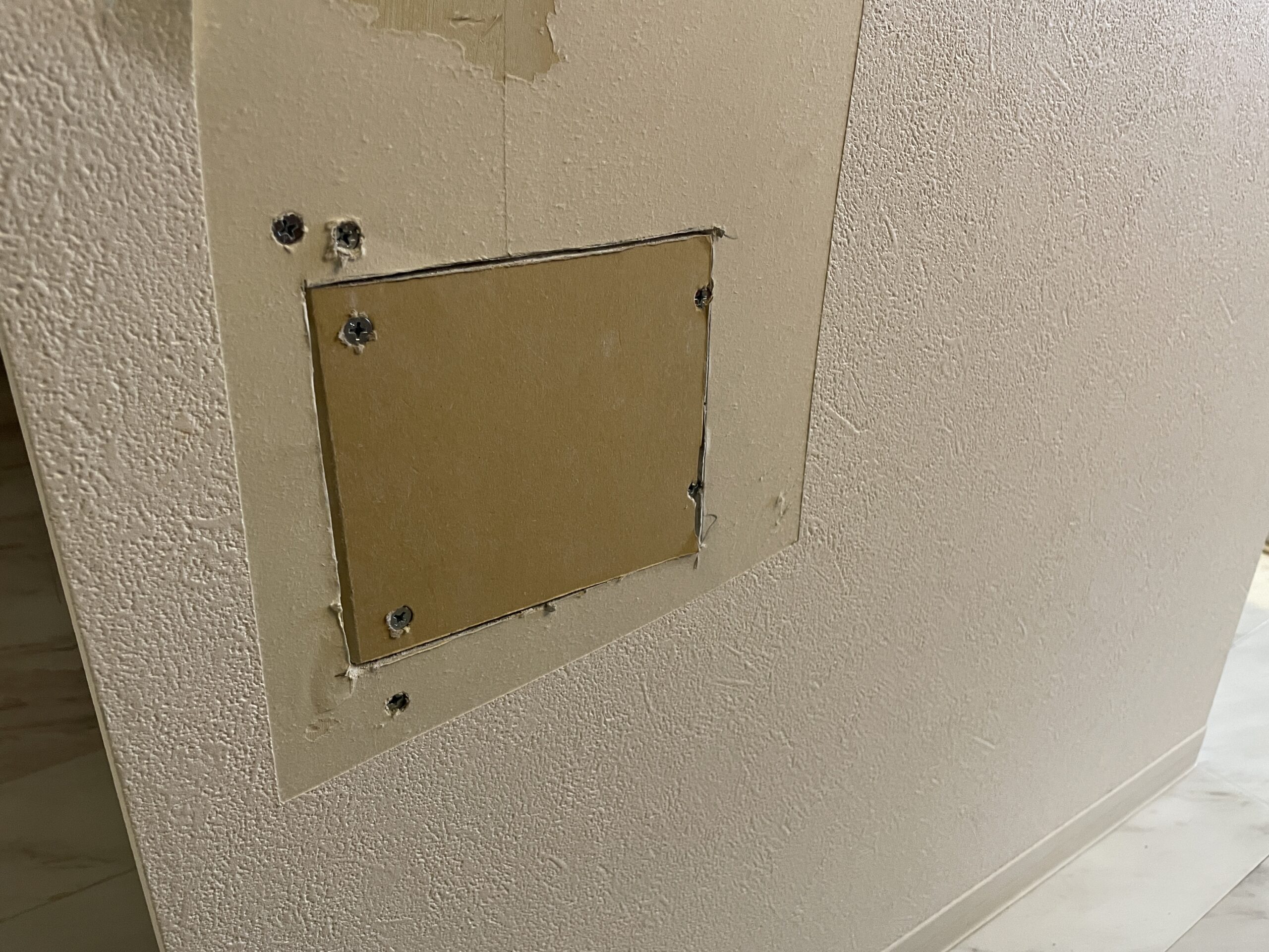 石膏ボードのパッチを穴のサイズに合わせてカットし、しっかりと固定しました。このとき、裏側に木片を取り付けて、パッチがしっかりと固定されるようにします。