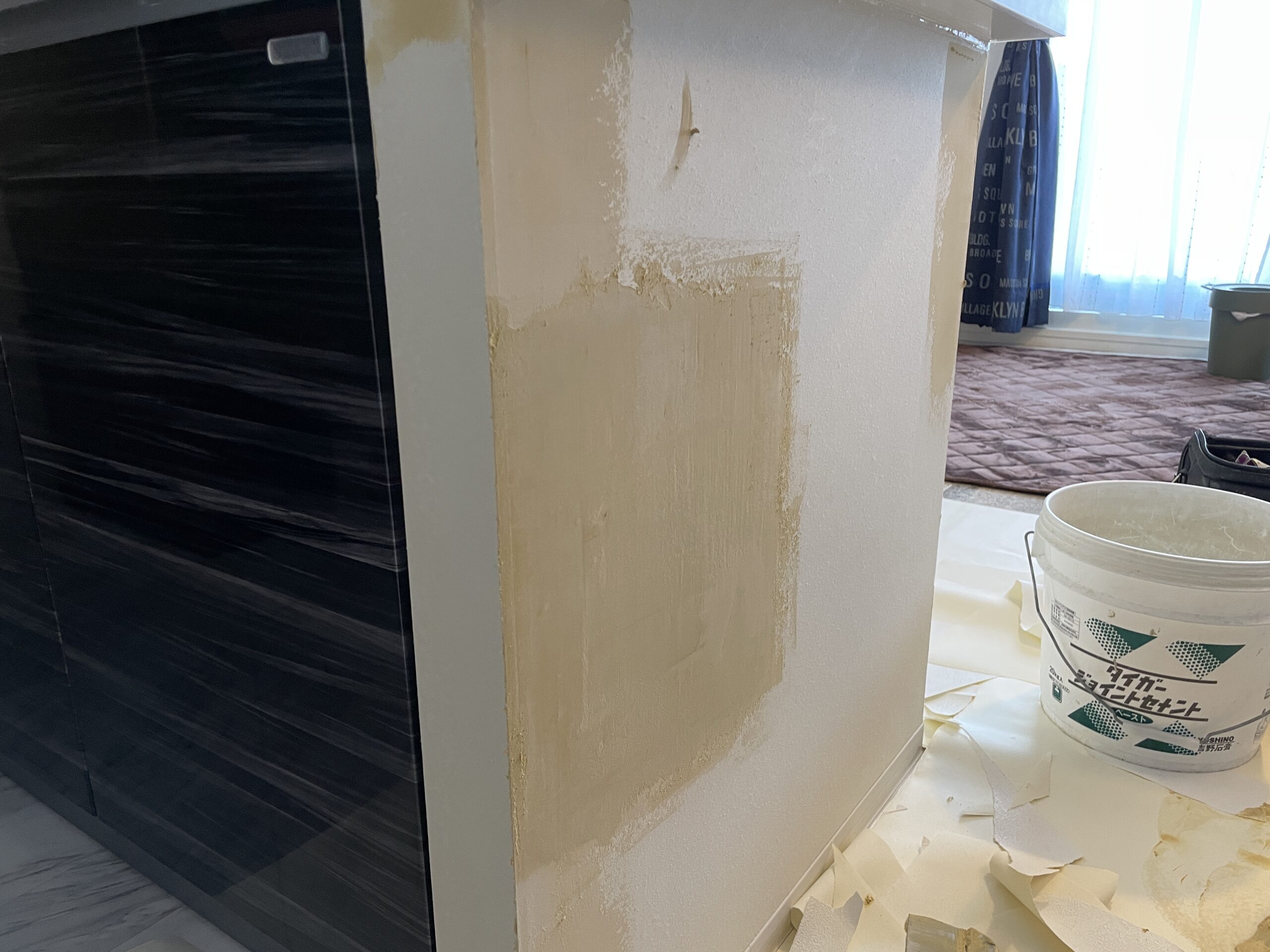 パッチの周囲と既存の壁との間にできる段差をなくすために、パテ処理を行いました。複数回に分けてパテを塗り、乾燥後にサンドペーパーで平滑に仕上げます。