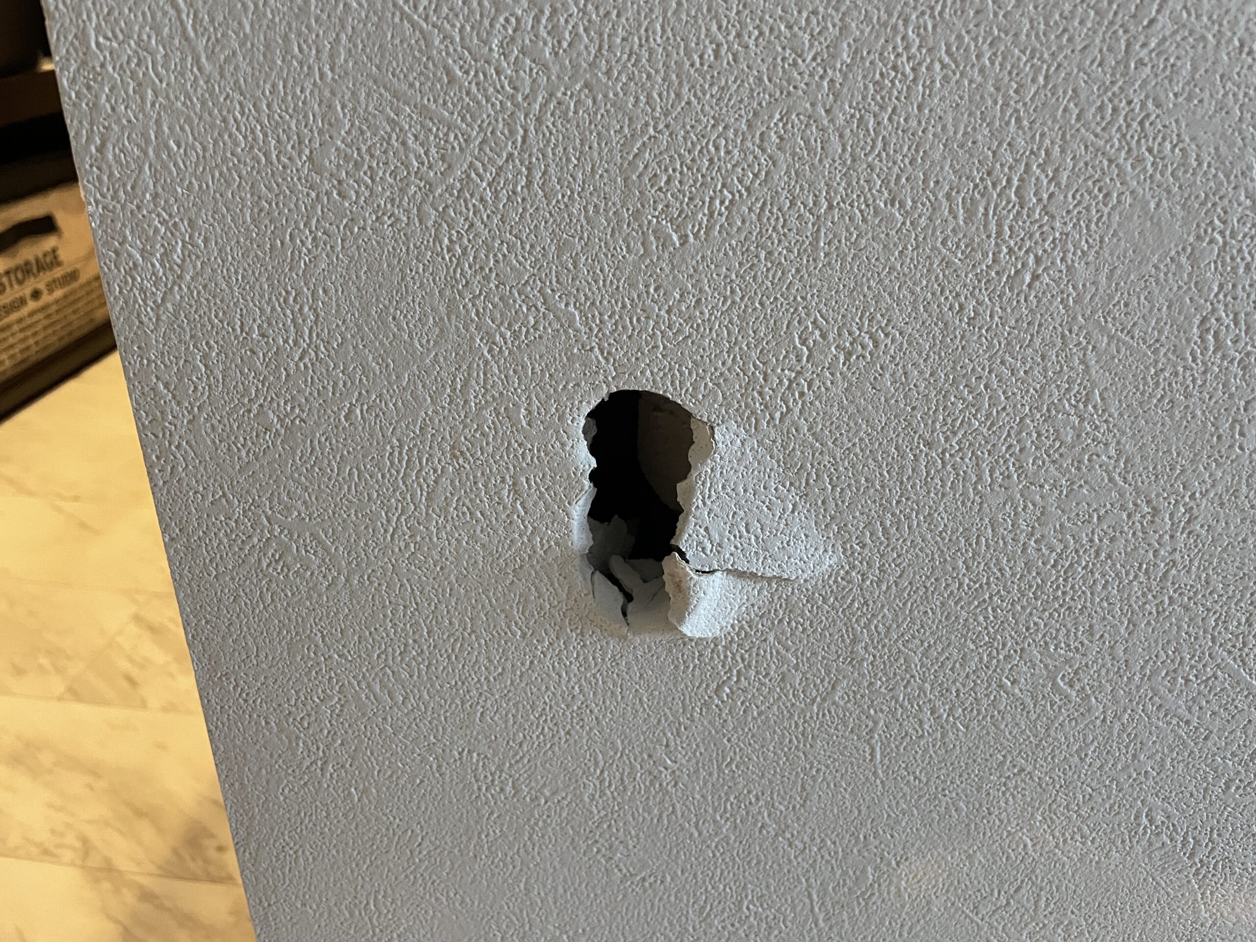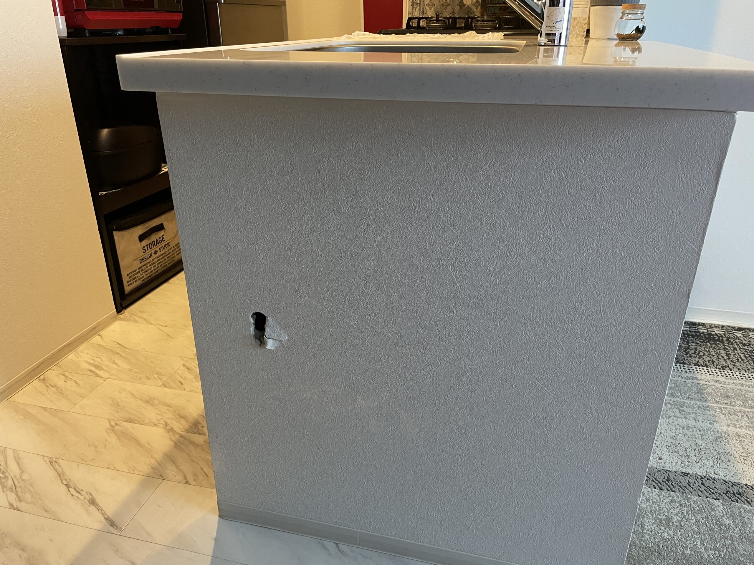 お客様からダイニングの壁に家具の角をぶつけてしまい、穴をあけてしまったとのご依頼をいただきました。早速、現地調査を行い、補修工事を実施しました。