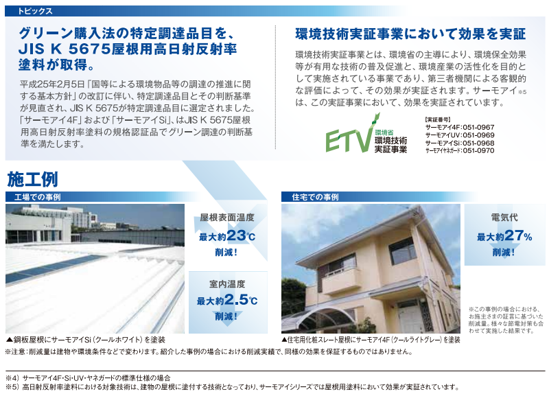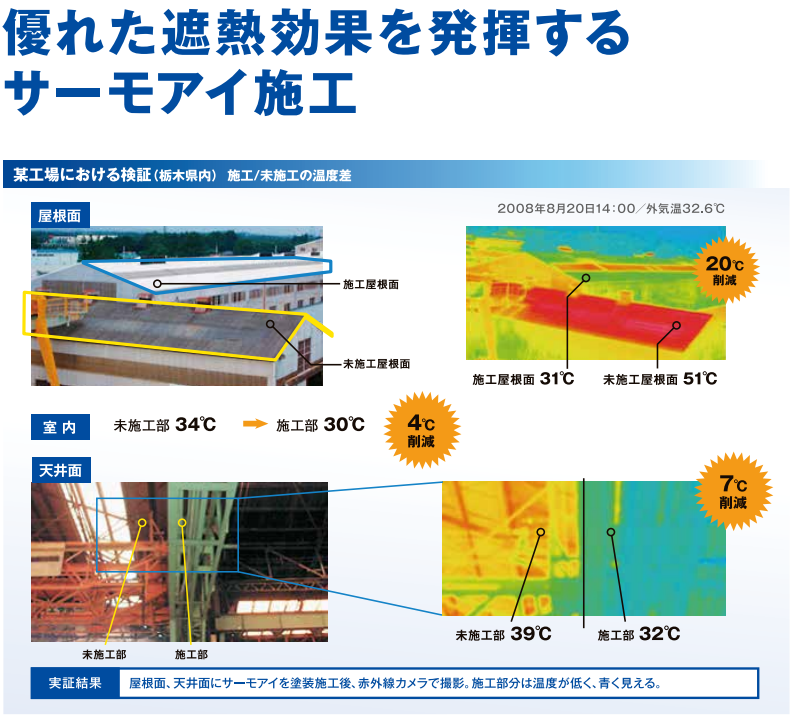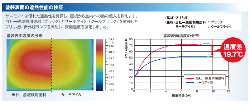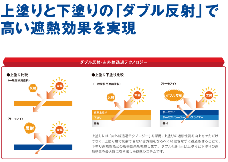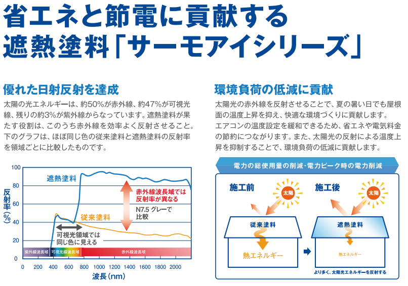 今回注目するのは、日本ペイント株式会社の「サーモアイシリーズ」。この塗料は、特殊な技術で日射反射率を高める設計となっており、真夏の強烈な太陽光を効率的に跳ね返すことができます。その結果、屋根表面の温度上昇を抑え、室内への熱の侵入を減少させることが可能です。