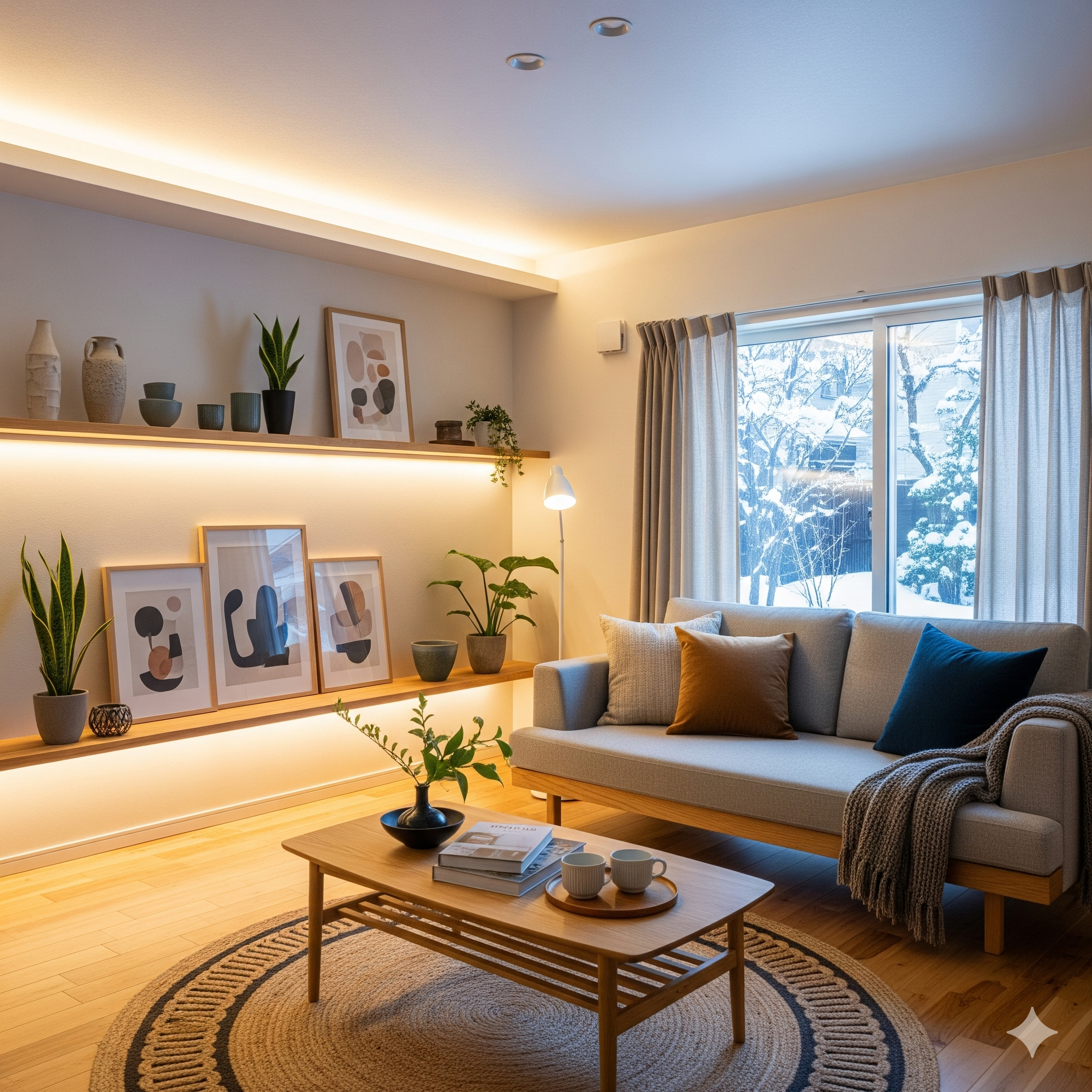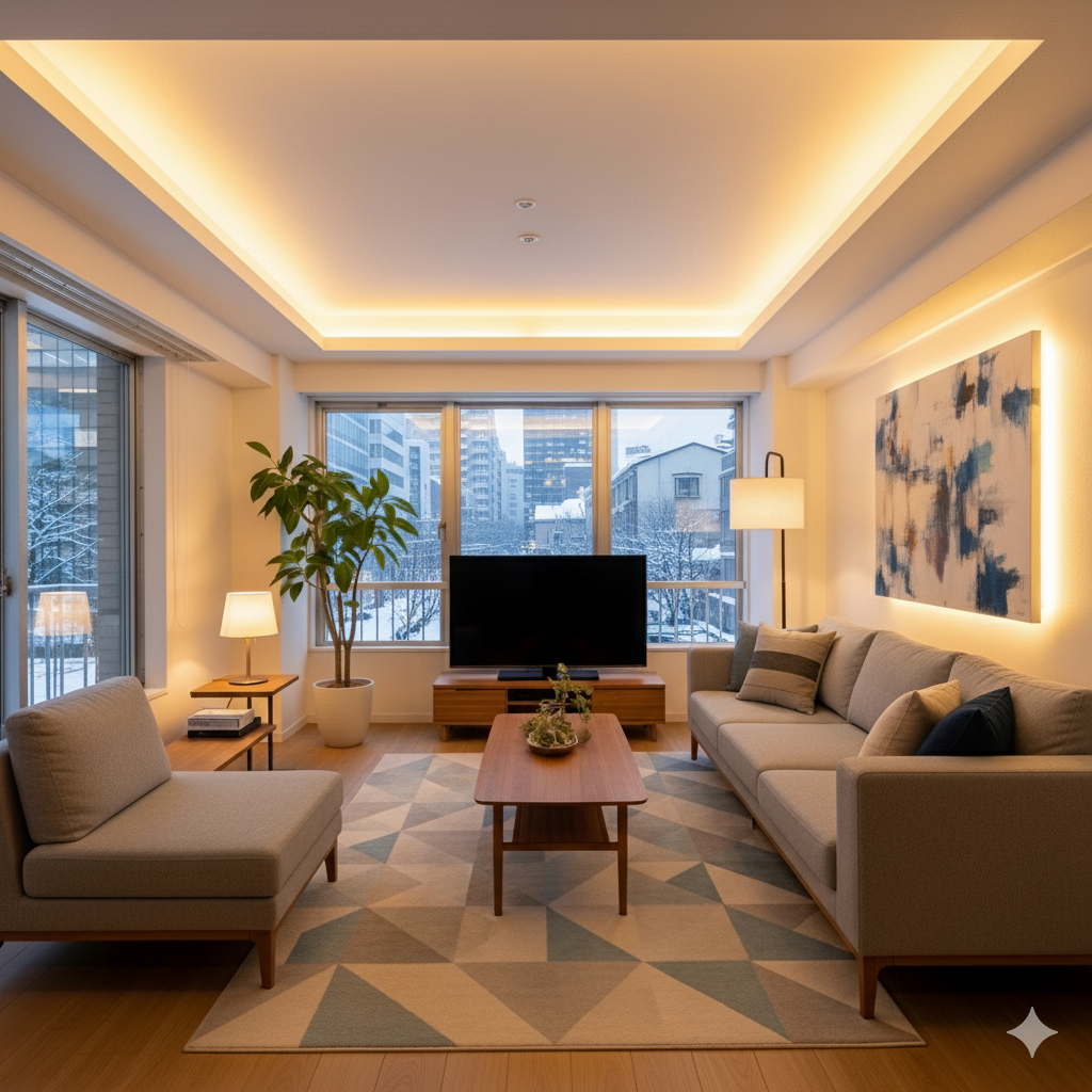 そう思われる方もいらっしゃるかもしれません。しかし、照明を工夫するだけで、お部屋の雰囲気は劇的に変わります。特に、壁や天井に間接照明を設置すると、ホテルやカフェのような、おしゃれでくつろげる空間に生まれ変わります。今回は、その魅力と設置方法についてご紹介します。
