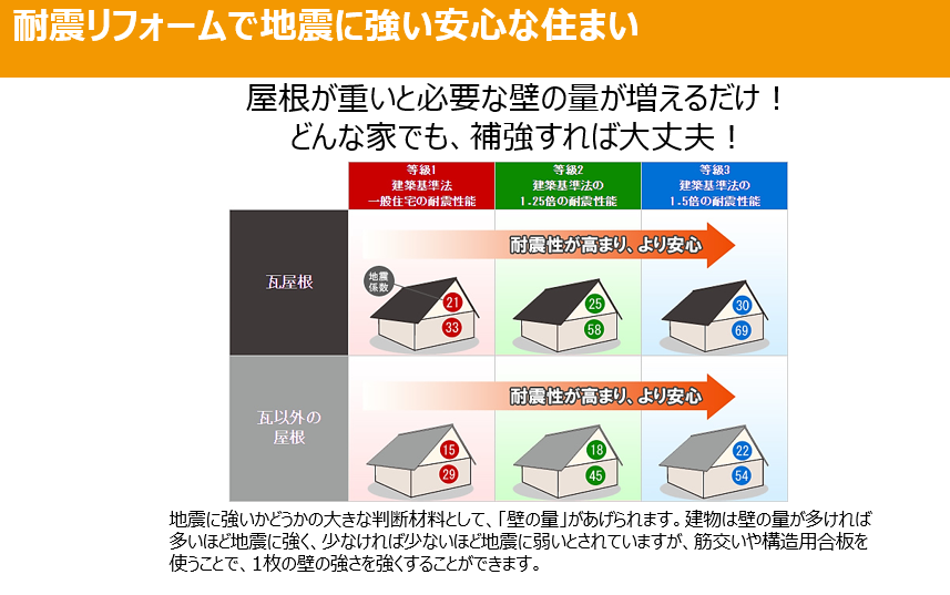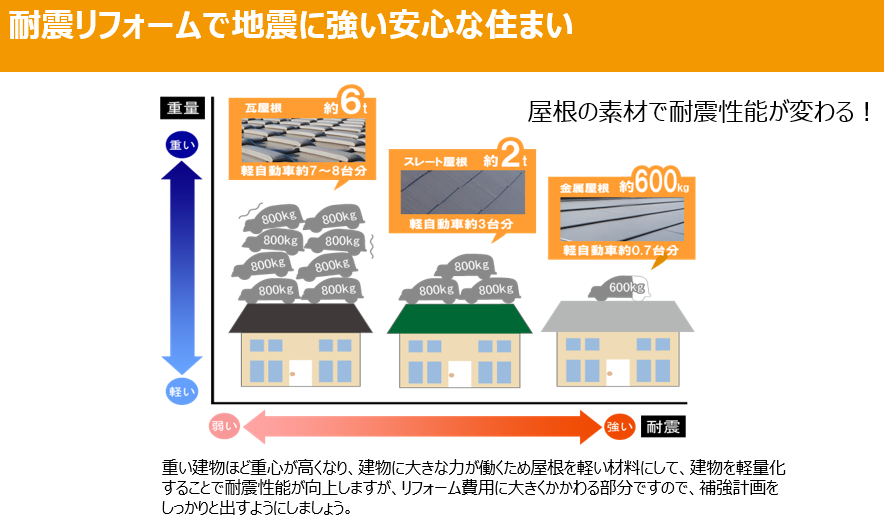 - 屋根の軽量化:重い屋根は地震時の倒壊リスクを高めるため、軽量化することでリスクを軽減します。