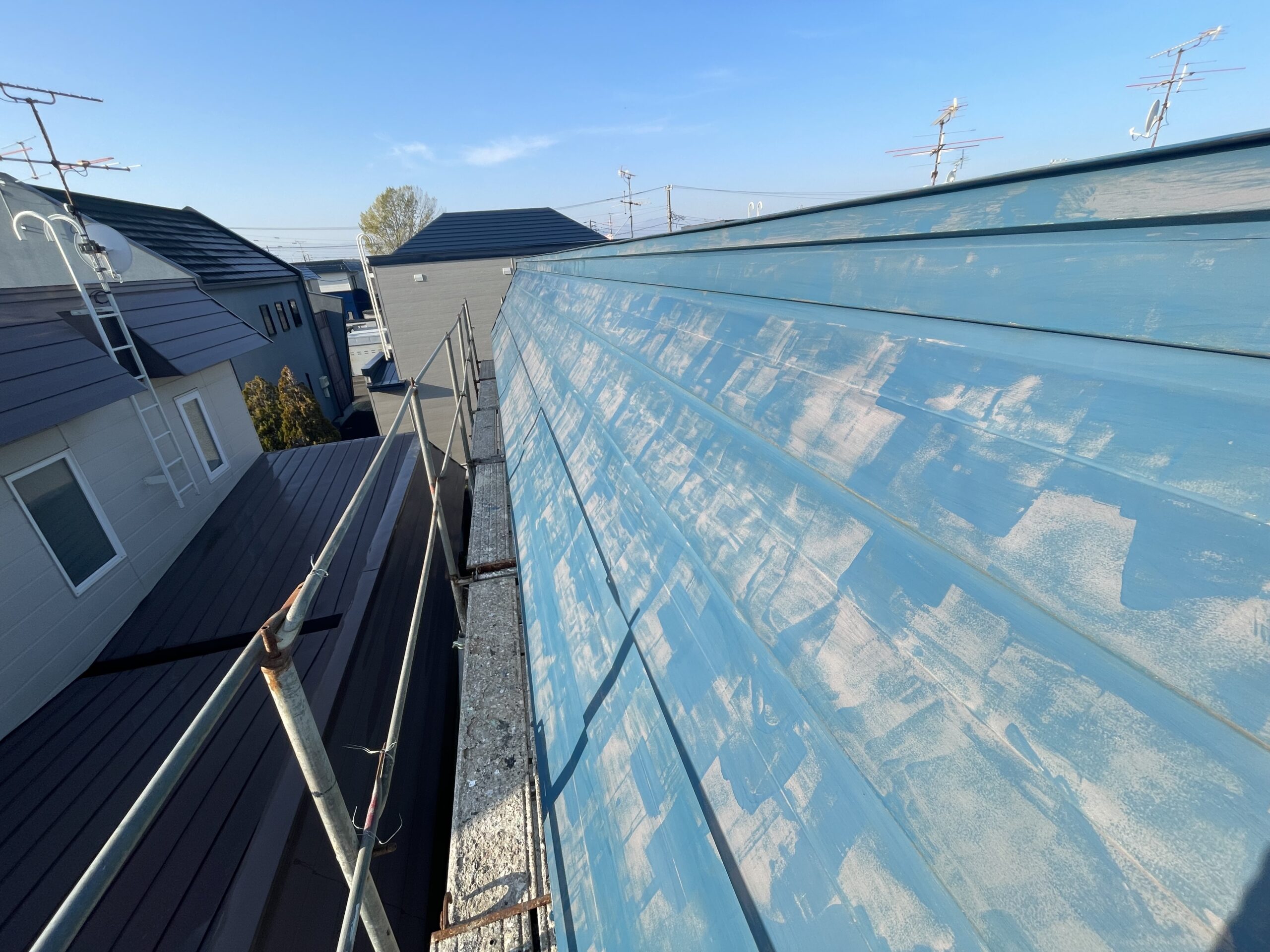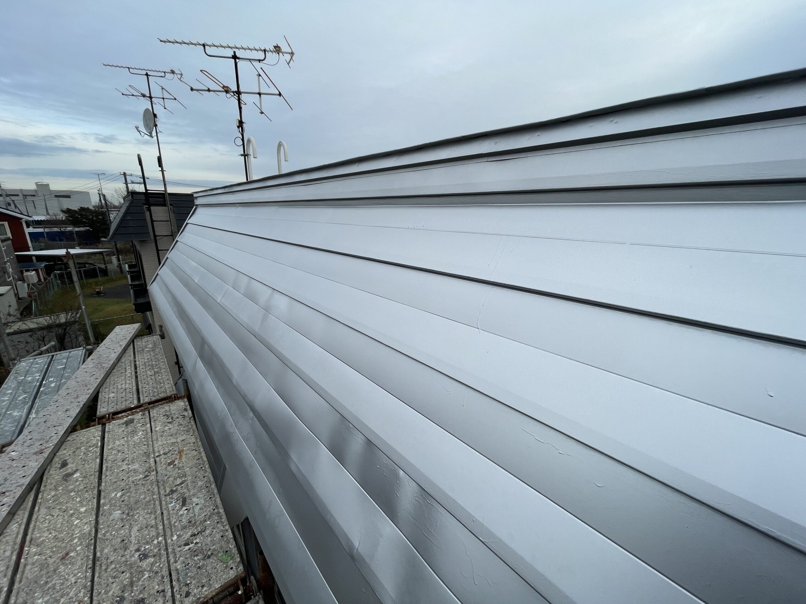 屋根の塗装依頼をいただき、施工を行いました。今回の工事では、鮮やかな青い屋根をシルバー色に塗り替え、見違えるように生まれ変わりました。