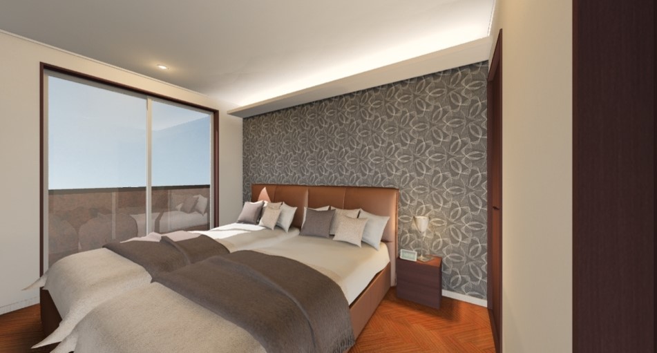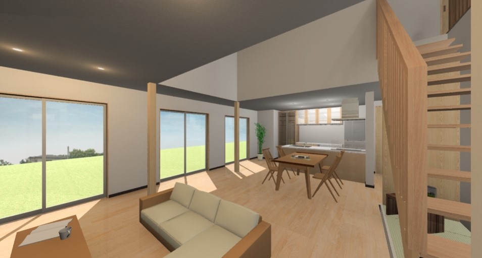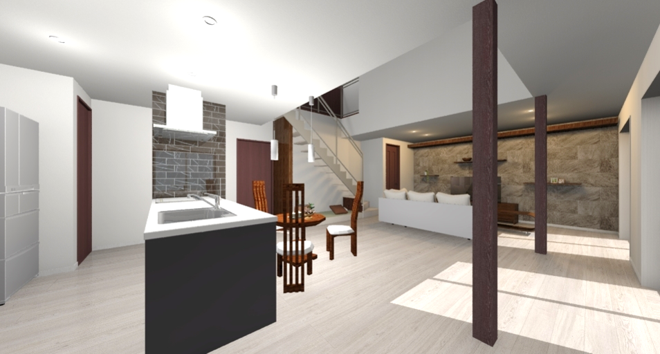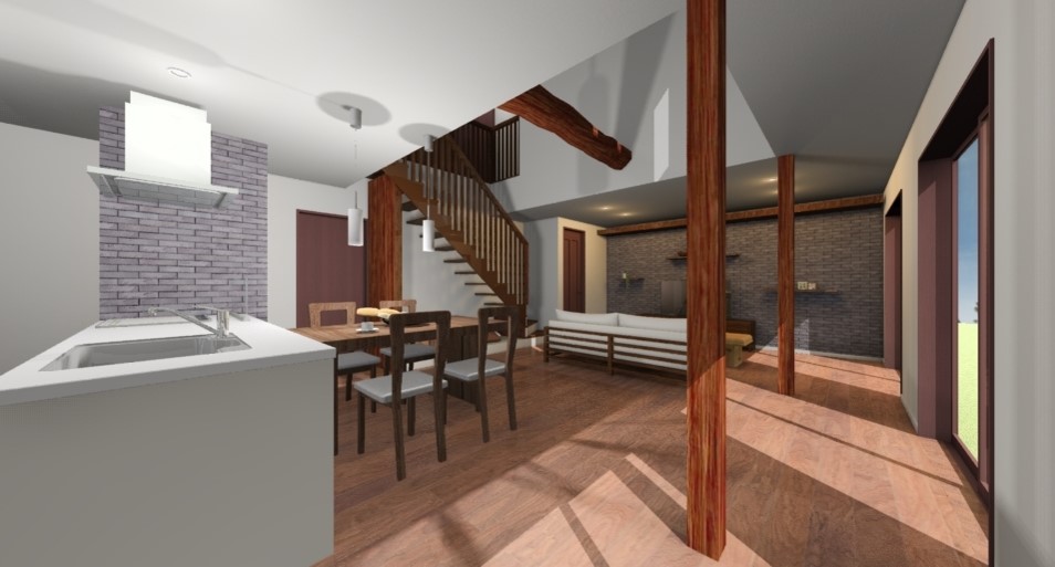 丸太梁と木の柱がモダンな空間とマッチした和モダンを演出